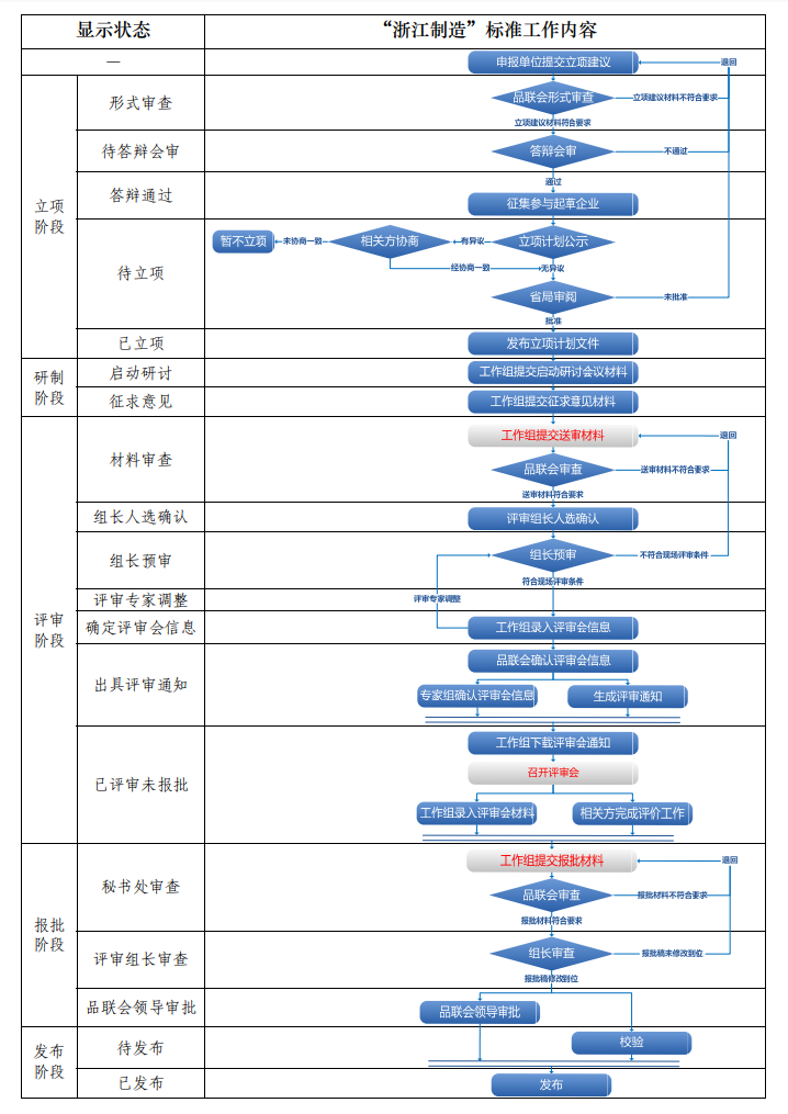 立项阶段具体工作内容及要求见《“浙江制造”标准立项论证细则》,研制阶段具体工作内容及要求见《“浙江制造”标准研制细则(试行)》,评审阶段和报批阶段具体工作内容及要求见《浙江制造”标准审评和批准发布细则》。